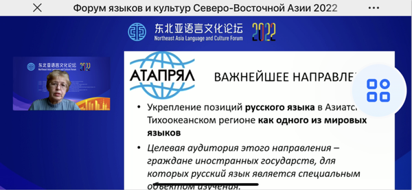 8月25日-26日,2022东北亚语言文化论坛在辽宁大连举办。本次论坛由教育部语言文字信息管理司和辽宁省教育厅共同指导,中国教育国际交流协会主办,大连外国语大学承办,北京外国语大学国家语言能力发展研究中心、上海外国语大学中国外语战略研究中心、郑州大学汉字文明传承传播与教育研究中心和上海市教育科学研究院国家语言文字政策研究中心协办。受中国教育国际交流协会邀请,我校俄罗斯籍专家伊丽娜·安德烈耶娃副教授参加论坛并发言。