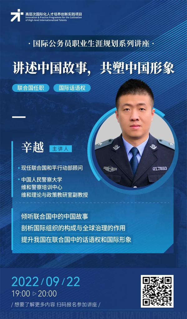 9月22日19:00,中国人民警察大学维和警察培训中心维和理论与政策教研室副教授、联合国维和警察核心岗位培训能力建设与发展大师教官、联合国和平行动部顾问辛越担任主讲人,他将结合时代背景与国际组织发展现状,讲述我国在联合国提升话语权与国际形象的历程,让同学们进一步理解在国际舞台讲好中国故事的重要意义。