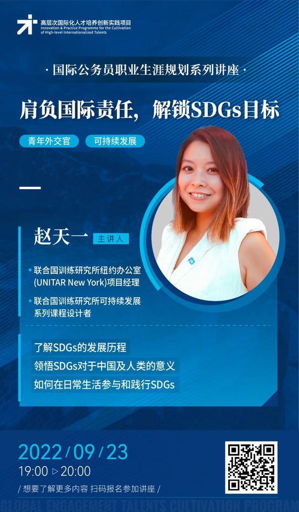 9月23日19:00,联合国训练研究所纽约办公室(UNITAR New York)项目经理、联合国训练研究所可持续发展系列课程设计者赵天一,将带来《肩负国际责任,解锁SDGs目标》讲座。
