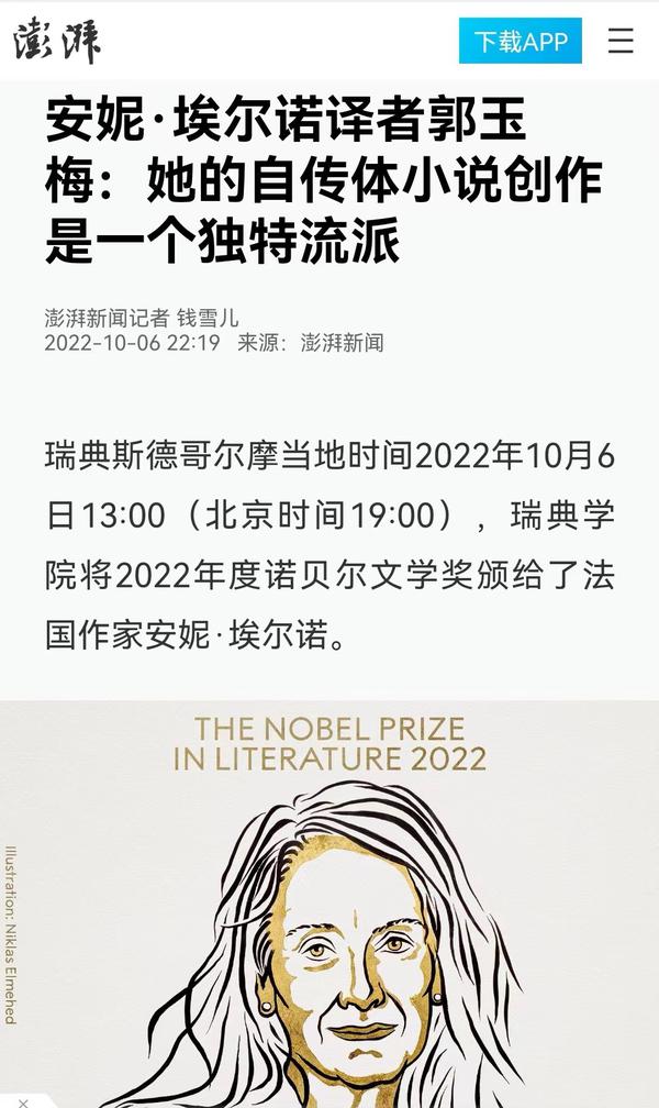 瑞典斯德哥尔摩当地时间2022年10月6日13:00(北京时间19:00),法国作家安妮·埃尔诺荣获2022年度诺贝尔文学奖。由乐鱼·体育欧洲语言文化学院法语系教授郭玉梅翻译的安妮·埃尔诺的小说《耻辱》《位置》和《一个女人》于2003年出版,之后,她在《法国研究》上发表了论文《追求“再现真实”与“内心流亡”的安妮·埃尔诺》。据悉,上海人民出版社即将再版郭玉梅的译著《一个男人的位置》和《一个女人的故事》。同时,我校法语系陈淑婷老师翻译的安妮·埃尔诺小说《一个女孩的记忆》也将同时出版。