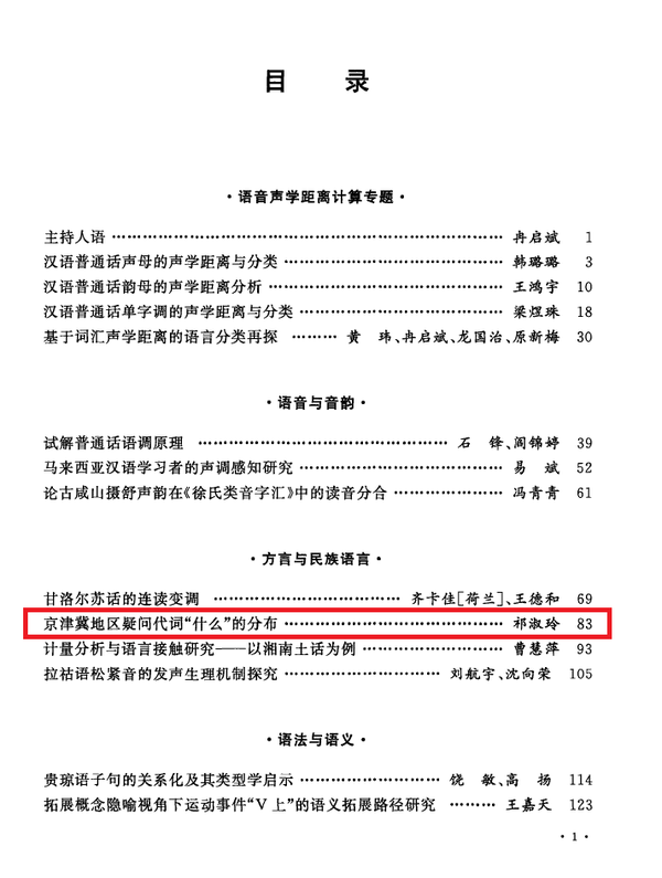 学术论文《京津冀地区疑问代词“什么”的分布》发表于期刊《南开语言学刊》2021年第2期,该刊为CSSCI来源集刊,ISBN号为978-7-100-21052-2。