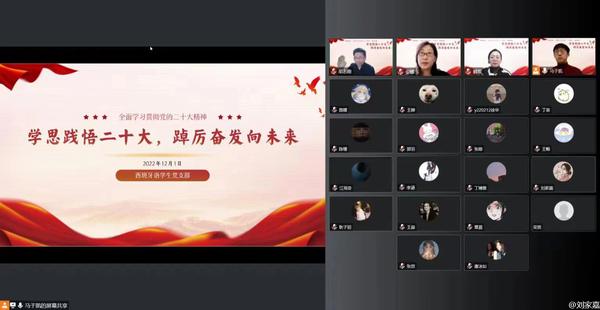 为深入学习贯彻党的二十大精神,用党的二十大精神统一思想、认识和行动,用党的创新理论武装头脑、指导实践,充分发挥党员的先锋模范作用,12月1日,欧洲语言文化学院西班牙语学生党支部召开了以“学思践悟二十大,踔厉奋发向未来”为主题的党日活动,联系该支部的校党委副书记胡志刚出席活动并讲话。党委学工部副部长荣滨,欧洲语言文化学院党委书记安娜、党委副书记韩菲参加活动。