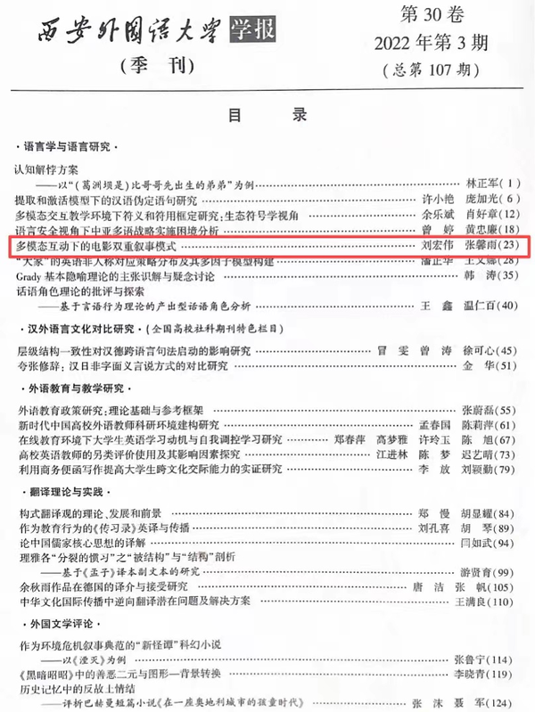 学术论文《多模态互动下的电影双重叙事模式》发表于期刊《西安外国语大学学报》2022年第3期,该刊为中文社会科学引文索引(CSSCI)来源期刊扩展版、北京大学《中文核心期刊要目总览》来源期刊,ISSN号为1673-9876。该论文系国家自然科学基金项目“电影故事交互式智能生成理论与方法”(项目编号:61877044)的阶段性研究成果,公开发表后被“语言学通讯”以及“翻译学通讯”微信公众号全文转载。