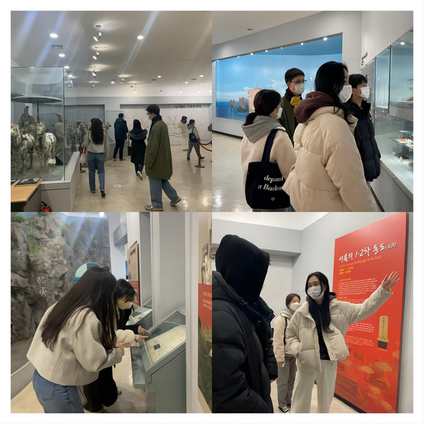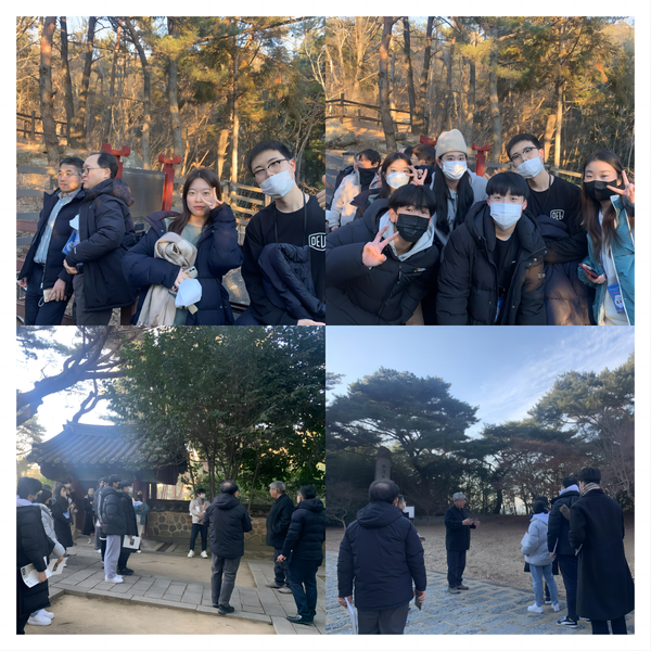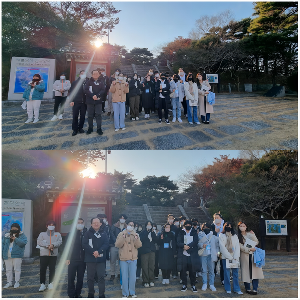 讲座过后,南海徐福研究会金圣哲事务局长带领学生们前往良阿里锦山上观摩了这处蝌蚪籀文石刻。通过实地考察,学生们深切感受到了徐福文化珍贵的历史价值。徐福文化所蕴含的中华民族精神,所彰显的中华文明魅力,深深吸引了学生们的关注,也激发了他们对徐福文化的探究兴趣。学生们在事务长的带领下还参观了闲丽海上国立公园,了解了朝鲜王朝时期露梁海战中李舜臣将军与明朝邓子龙将军共同抗击日寇的历史故事,对中韩文化交流的历史有了进一步的认识。