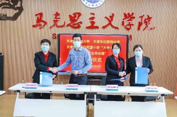 依托天津市大中小学思政工作一体化研究中心,录制“奥运思政”主题开学第一课,举办首届天津市大中小学思政工作一体化工作论坛,承办天津市首届中小学骨干教师德育实践工作能力研修培训班、天津市高校“大学生年度人物”终评会等大型活动,与田家炳中学、同望小学等共建签约,与天津中学联合开展天津文化线上英语角活动,《天津教育报》头版头条报道我校积极探索大中小学思政一体化“天外模式”。