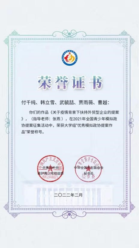学生提案作品荣获全国“优秀模拟政协提案作品”