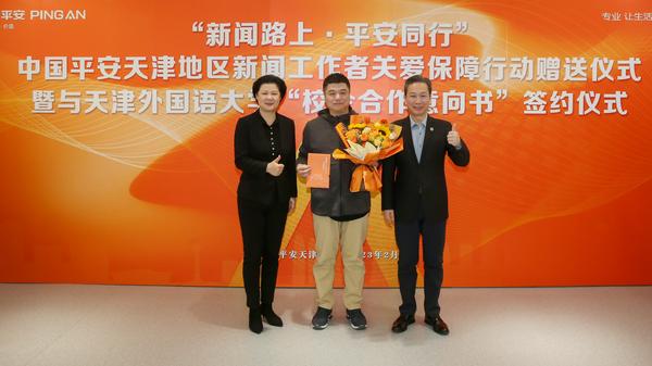 中国平安天津分公司行政部经理胡智东对新闻工作者关爱保障计划的背景进行介绍。余江和余丰向第三十二届中国新闻奖一等奖获得者、我校翻译与跨文化传播研究院外国语言文学文化研究中心教师王佳音赠送鲜花和平安保险专属服务卡。