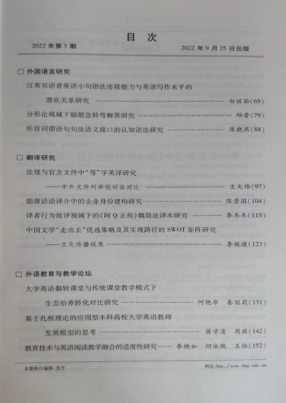 学术论文《汉英双语者英语小句语法连接能力与英语写作水平的潜在关系研究》系作者主持的国家社科基金项目“汉英双语者英语篇章衔接知识应用能力诊断测试及补救策略研究(20BYY210)”的阶段性研究成果,发表在《外国语文》2022年第5期。《外国语文》为北大核心来源期刊、中文外国语类核心期刊、中国人文社科学报核心期刊扩展版、中国科技核心期刊、全国高校优秀社科期刊等,ISSN号为1674-6414。
