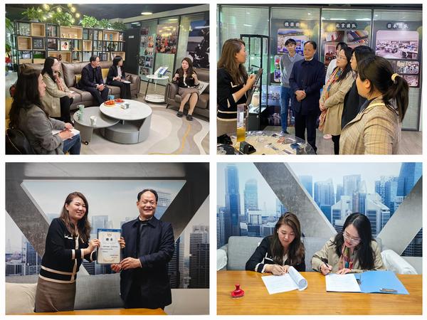 随后,前往天津岐塑科技有限公司实地走访,公司负责人、校友张旭表达了对母校的热爱和授业恩师的感激,分享其职场经验和创业经历,详细介绍了公司的发展理念、技术团队、设计产品等,强调了科研创新、产品品质对于企业的重要性、实习实践经验对于学生增强求职竞争力、助力其迅速适应职场的重要性,老师们还与目前正在公司实习的学生进行交流,鼓励他们努力学习,更快掌握其工作岗位所需技能,迅速适应职场。刘申琦与张旭现场签订实习实践基地协议,尹德献颁发企业导师证书,初相娟邀请其到校内开展学生创新创业培训。