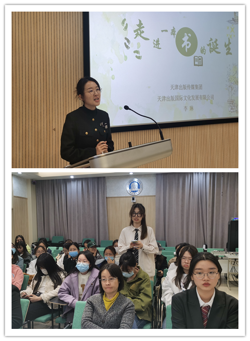 传媒系党支部书记王静、副主任李彦分别介绍了专业建设及校内实习实践基地建设情况。刘海燕、郭晓明为2011届毕业生校友李琳颁发了行业导师聘书,院长项成东、传媒系王静共同为校内实习实践基地揭牌。行业导师李琳以“一本书是怎样诞生的”为题为师生作专题讲座,介绍了世界主要书展、引进版图书策划出版流程、书籍印刷流程以及出版社部门分工等同学们关心的行业领域问题,解答了学生对出版行业的疑问。