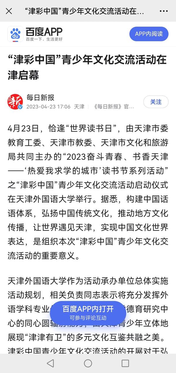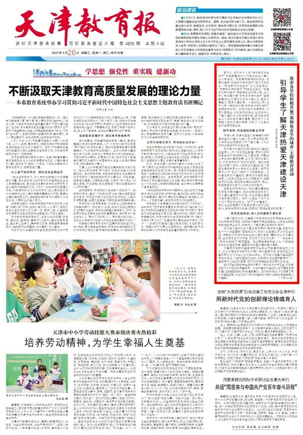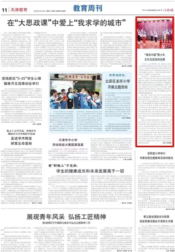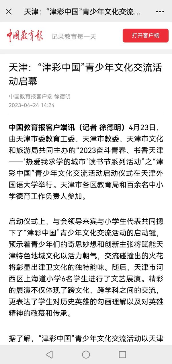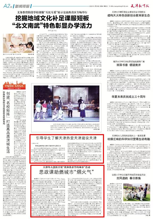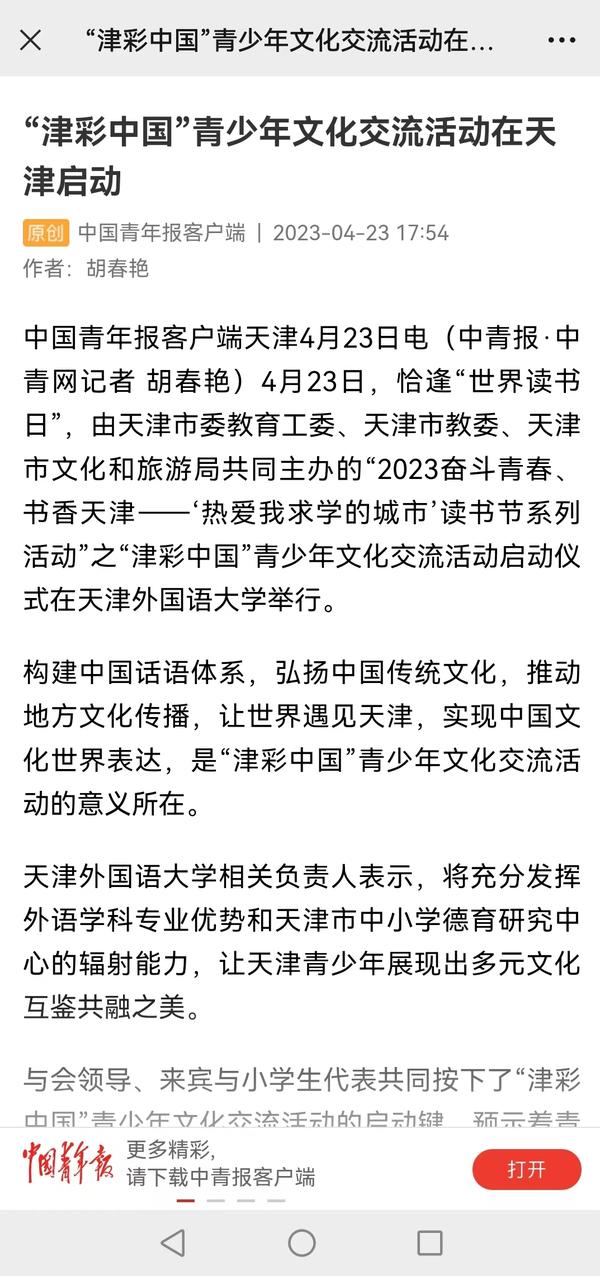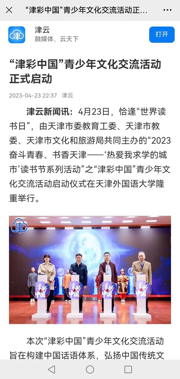 4月23日“世界读书日”之际,由天津市委教育工委、天津市教委、天津市文化和旅游局共同主办的“2023奋斗青春、书香天津------‘热爱我求学的城市’读书节系列活动”之“津彩中国”青少年文化交流活动启动仪式在我校大学生活动中心隆重举行。中国教育报、中国青年报、天津日报、津云、每日新报等媒体对此进行了报道。
