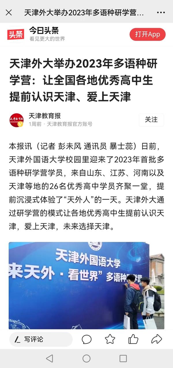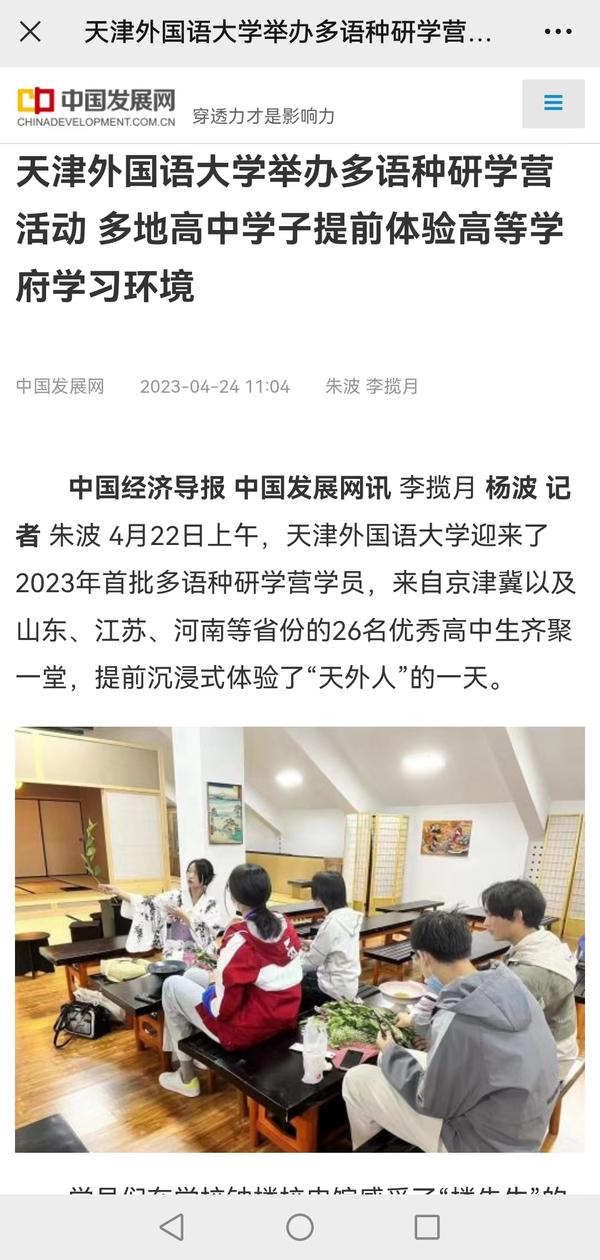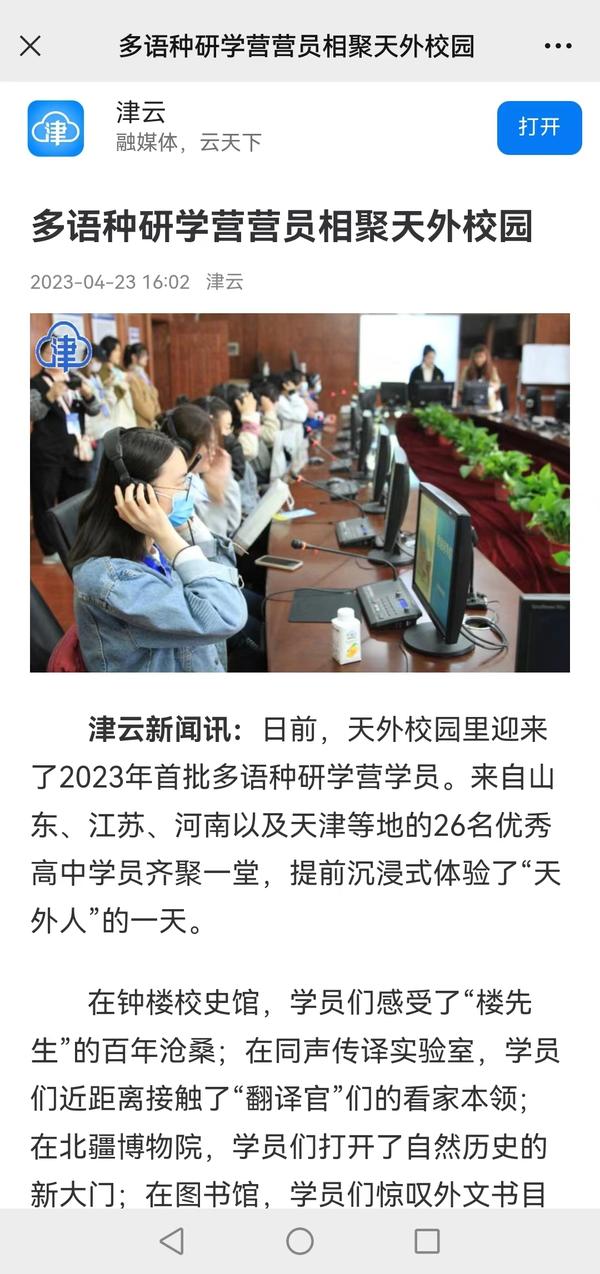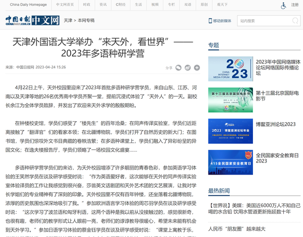 4月22日,天外迎来2023年首批多语种研学营学员,来自山东、江苏、河南以及天津等地的26名优秀高中学员齐聚一堂,提前沉浸式体验了“天外人”的一天。中国日报网、中国发展网、津云、天津教育报、今日头条等媒体对此进行了报道。