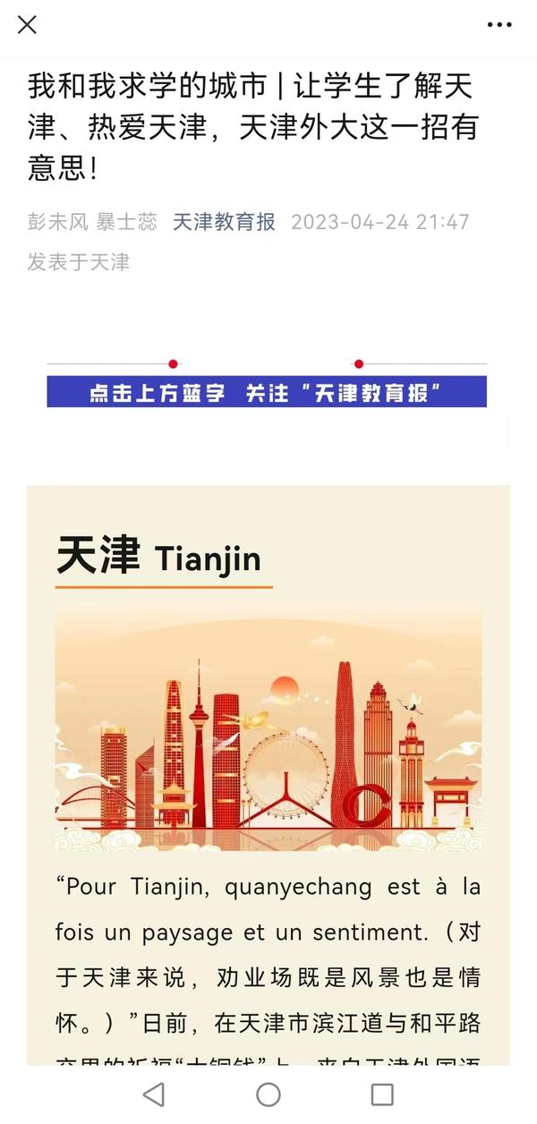 4月22日,为深入开展天津市教育两委“我和我求学的城市”主题教育活动,马克思主义学院“中国近现代史纲要”教研室面向2022级全体学生组织开展“我和我求学的城市 多语种讲解天津历史故事”活动,积极引导广大学生品味天津文化、感受天津魅力、服务天津发展。天津教育报对此进行了报道。