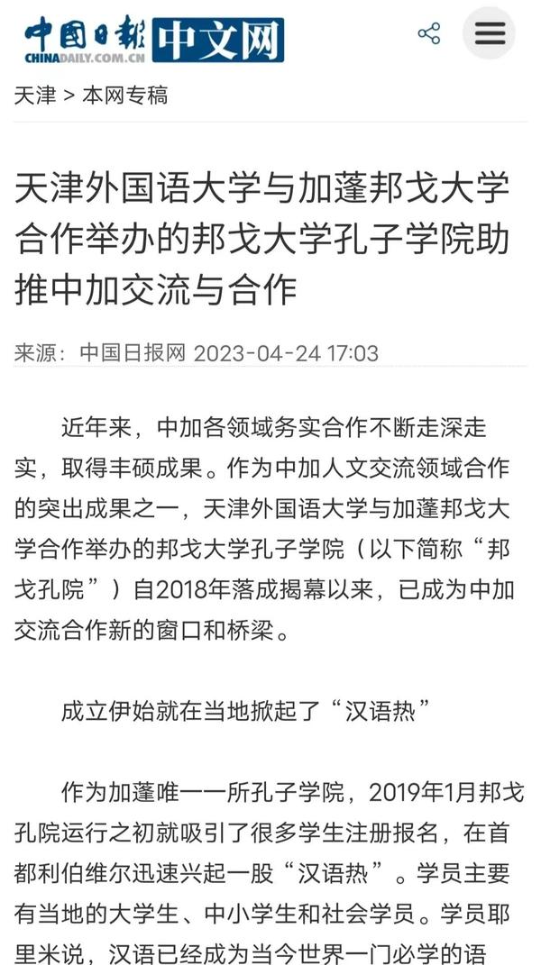 近日,国家主席习近平在人民大会堂同来华进行国事访问的加蓬总统邦戈举行会谈。这是邦戈总统时隔6年多再次对中国进行国事访问,对双边关系发展具有重要意义。近年来,中加各领域务实合作不断走深走实,取得丰硕成果。作为中加人文交流领域合作的突出成果之一,乐鱼·体育与加蓬邦戈大学合作举办的邦戈大学孔子学院(以下简称“邦戈孔院”)自2018年落成揭幕以来,已成为中加交流合作新的窗口和桥梁。人民日报客户端、中国日报网对此进行了报道。