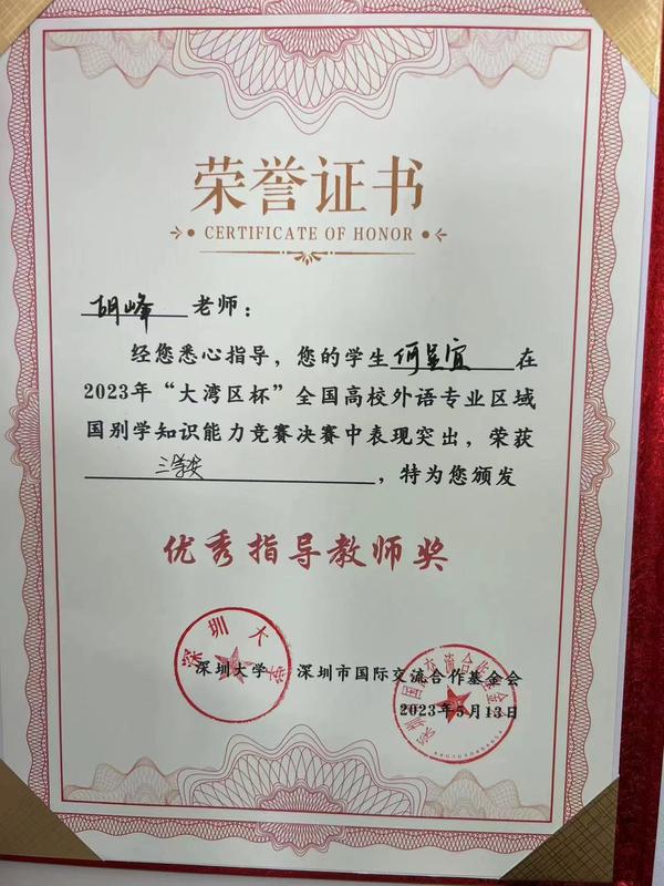 5月13日,2023年“大湾区杯”全国高校外语专业区域国别知识能力竞赛在深圳大学(粤海校区)落下帷幕。我校2020级本科生张楊晨、2022级硕士研究生何星宜分别荣获英语组三等奖、德语组三等奖,英语学院李正鸿老师、欧洲语言文化学院胡峰老师荣获优秀指导教师奖。