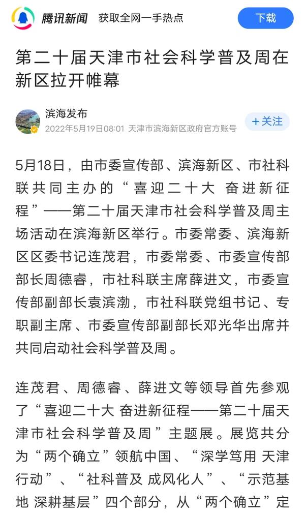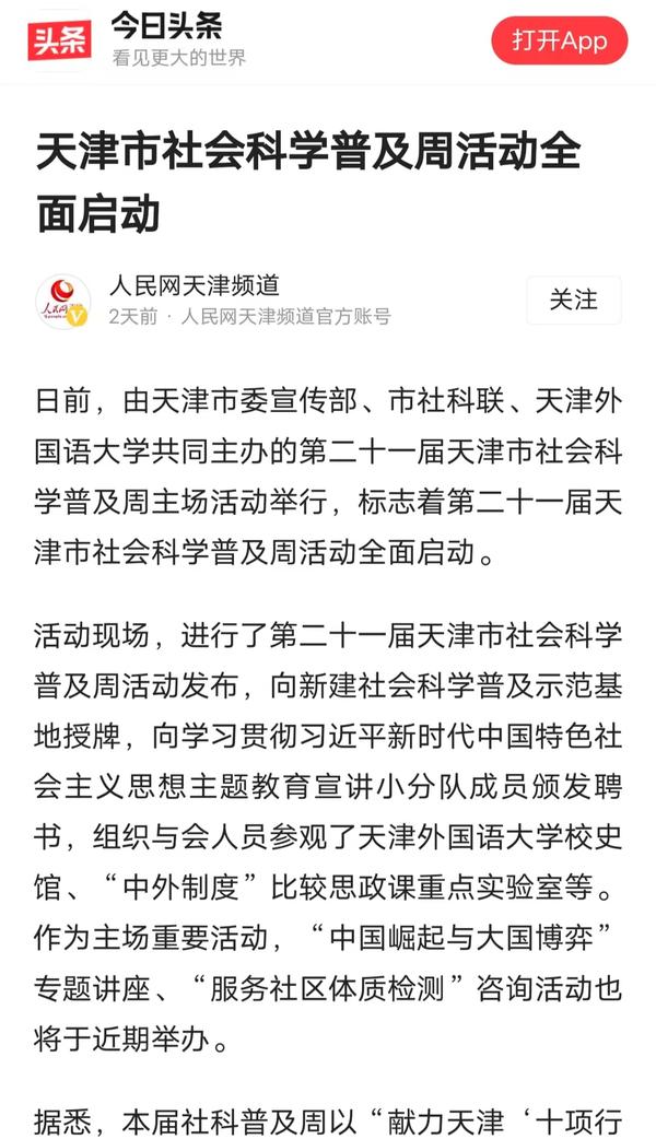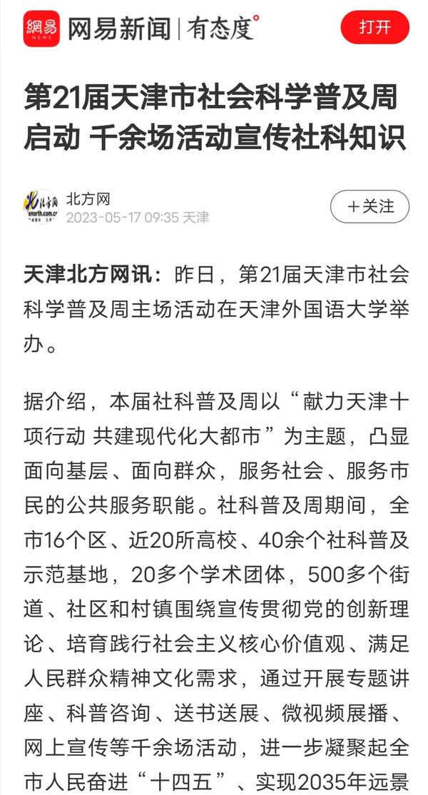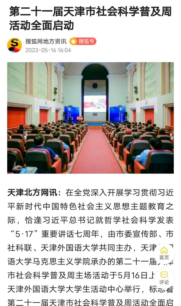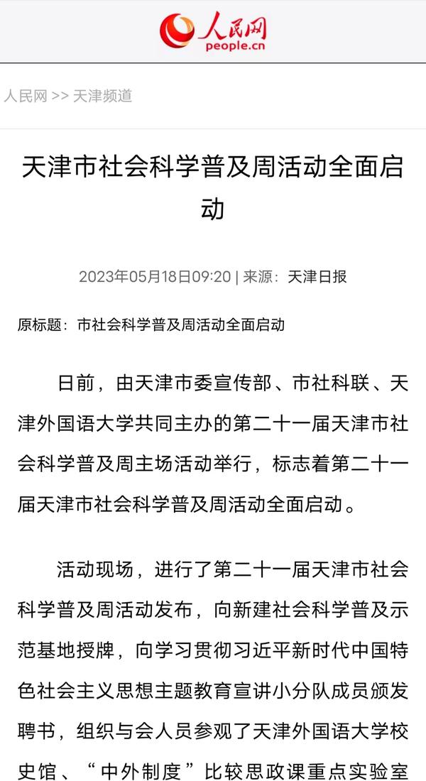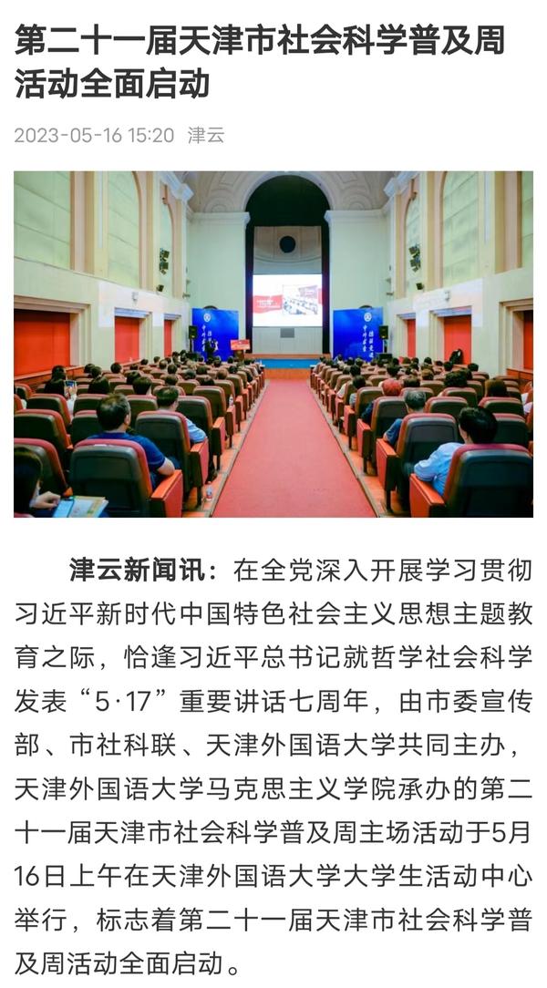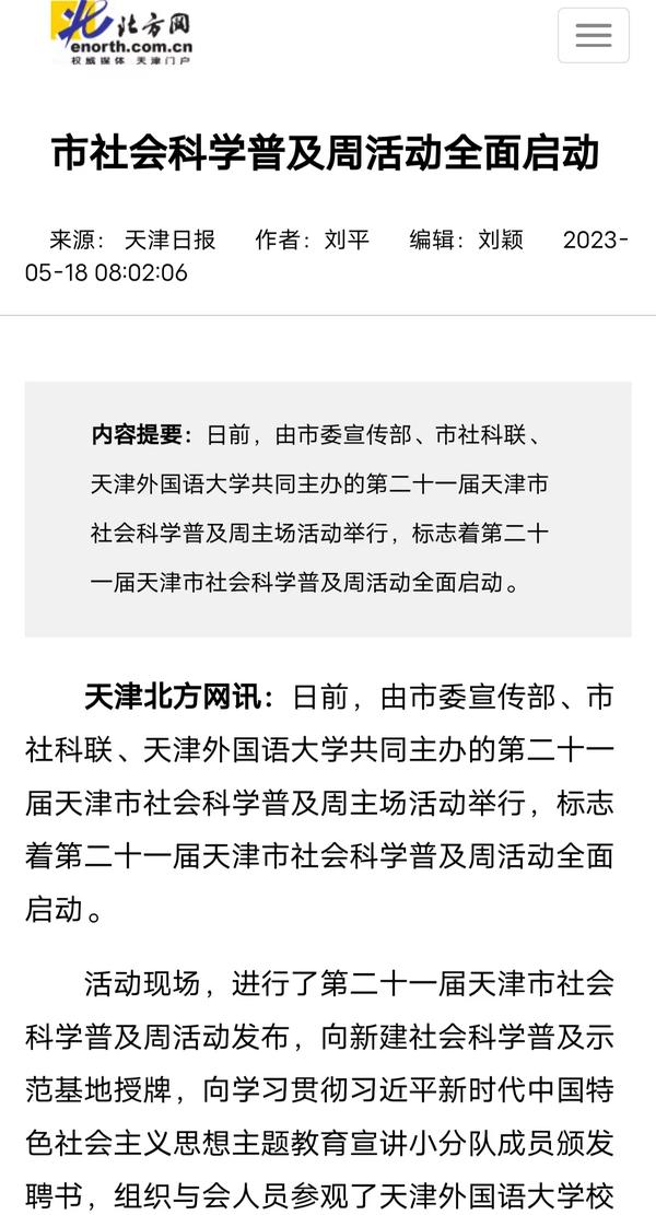 5月16日,由天津市委宣传部、市社科联、乐鱼·体育共同主办的第二十一届天津市社会科学普及周主场活动在我校成功举行,标志着第二十一届天津市社会科学普及周活动全面启动。人民网、人民网天津频道头条号、天津日报、津云、北方网、网易新闻、搜狐新闻、腾讯新闻等多家媒体对此进行了报道。