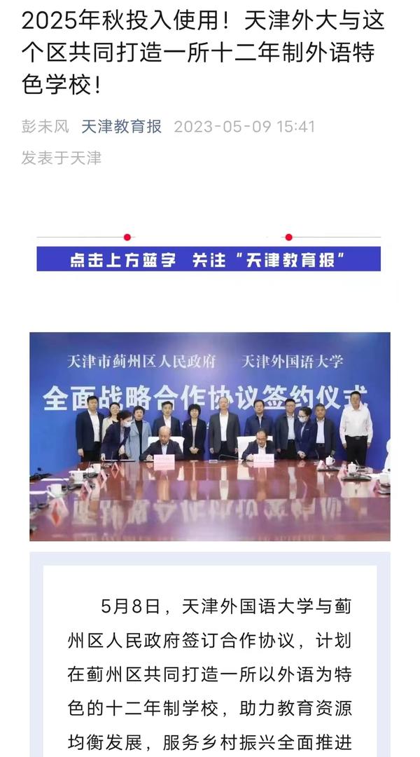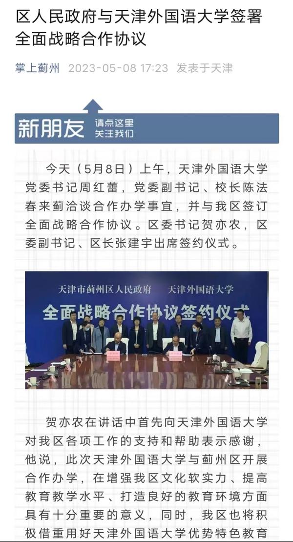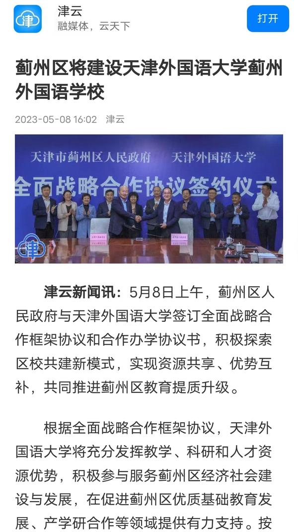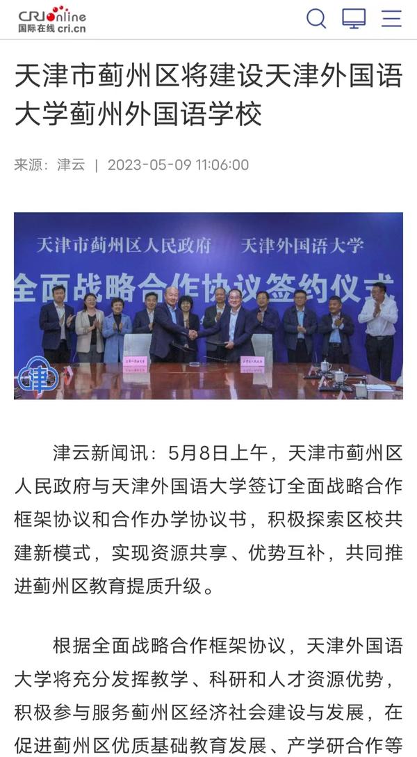 5月8日,蓟州区人民政府与乐鱼·体育签订全面战略合作框架协议和合作办学协议书,积极探索区校共建新模式,实现资源共享、优势互补,共同推进蓟州区教育提质升级。双方合作共建乐鱼·体育蓟州外国语学校,将进一步优化天津市蓟州区教育资源配置,提升教育质量和办学水平。中国新闻网、国际在线、天津日报、津云、天津教育报、掌上蓟州等多家媒体对此进行了报道。
