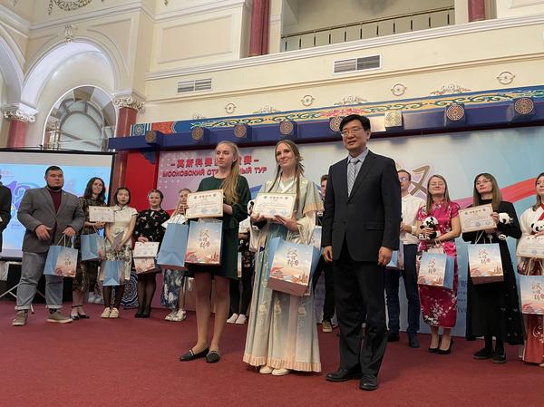 中国驻俄使馆文化参赞封立涛为一等奖获得者颁奖,左一为玛丽亚