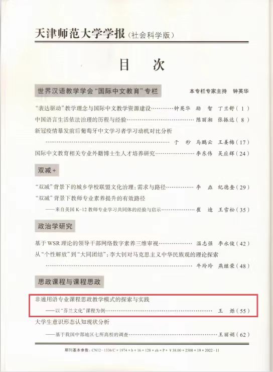学术论文《非通用语专业课程思政教学模式的探索与实践------以“芬兰文化”课程为例》发表于期刊《天津师范大学学报(社会科学版)》2022年第6期,该刊为北大核心来源期刊,ISSN号为1671-1106,全文约9000字。