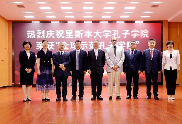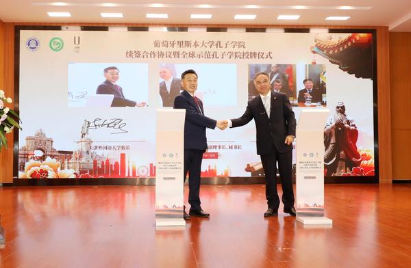 6月13日下午,葡萄牙里斯本大学孔子学院续签合作协议暨“全球示范孔子学院”授牌仪式通过线上线下相结合的形式隆重举行。葡萄牙驻华大使保罗·纳西门托,中国驻葡萄牙大使赵本堂,中国国际中文教育基金会副理事长、秘书长赵灵山,里斯本大学校长路易斯·费雷拉,天津市人民政府外事办公室副主任、一级巡视员赵剑岭,天津市委教育工委副书记刘怡蔓,乐鱼·体育党委书记周红蕾、校长陈法春在会上分别致辞。乐鱼·体育副校长李迎迎、相关部门负责人、海外孔子学院及专业师生代表参会。会议由周红蕾主持。