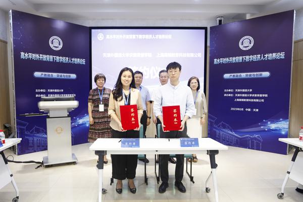 开幕式上,求索荣誉学院与上海高顿科技有限公司就共建数字经济产业学院签署意向书。论坛上,来自北京大学国家发展研究院BiMBA商学院、天津东疆综保区管委会、天津市商业保理协会、腾讯教育、唯你科技、上海高顿教育科技有限公司、天津商务职业学院、天津紫希国际贸易有限公司及深圳市跨境电子商务协会天津分会、中国中金财富天津分公司的代表,就数字经济人才培养、天津数字经济产教联合体构建、国际化数字经济产业学院建设、国际化数字经济人才培养与人才需求联动机制、专业优化与课程建设、政产学研用协同等主题作了主旨发言和交流,进行了深入研讨。