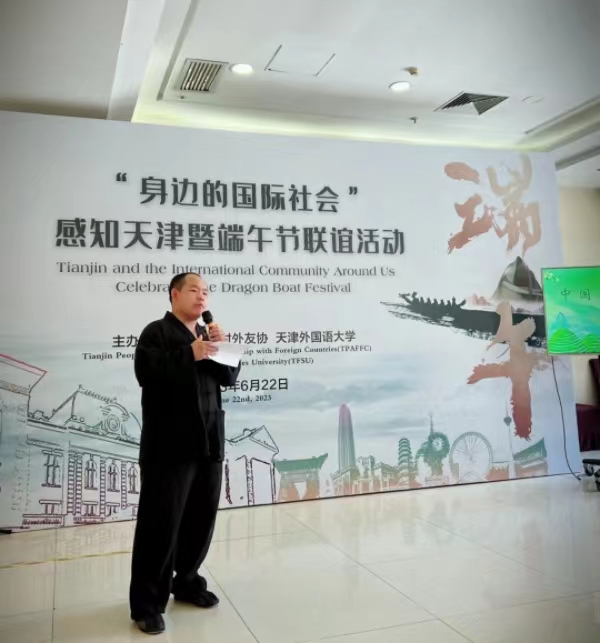 为深入开展“身边的国际社会”感知天津活动,对外宣传展示中华传统文化和活力美好的天津形象,使“身边的国际社会”感知体验中国传统节日——端午节的历史文化丰富内涵,6月22日,由市对外友协、乐鱼·体育主办,市教育两委、天津经济广播、天津市龙舟运动协会、中国日报天津站、市文旅摄影协会等单位支持的“身边的国际社会”感知天津暨端午节联谊活动成功举办,中外朋友共同欢度端午佳节。市对外友协副会长黄春艳、市委教育工委副书记刘怡蔓、乐鱼·体育副校长李迎迎、天津经济广播、生活广播总监刘承军、中国日报天津站站长杨成、市文旅摄影协会副主席韩宏等出席活动。