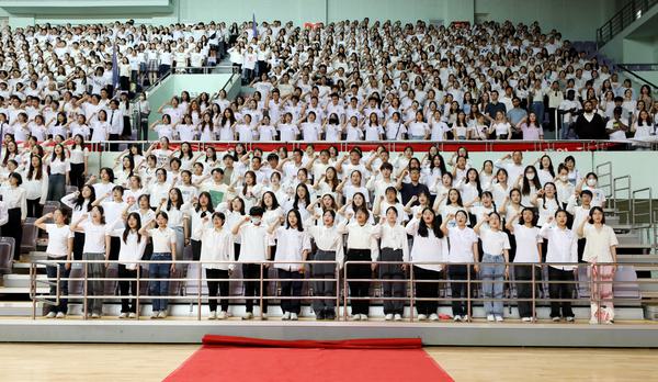 主席台领导为新生代表佩戴校徽、颁发学生证,并特别为每个班级赠送了“天外书单”的经典读物,拉开了师生阅读经典的序幕。在校生和新生代表分别发言,教师代表谆谆教诲,全体新生备受激励。