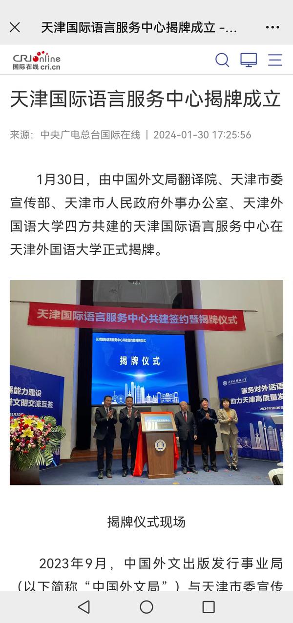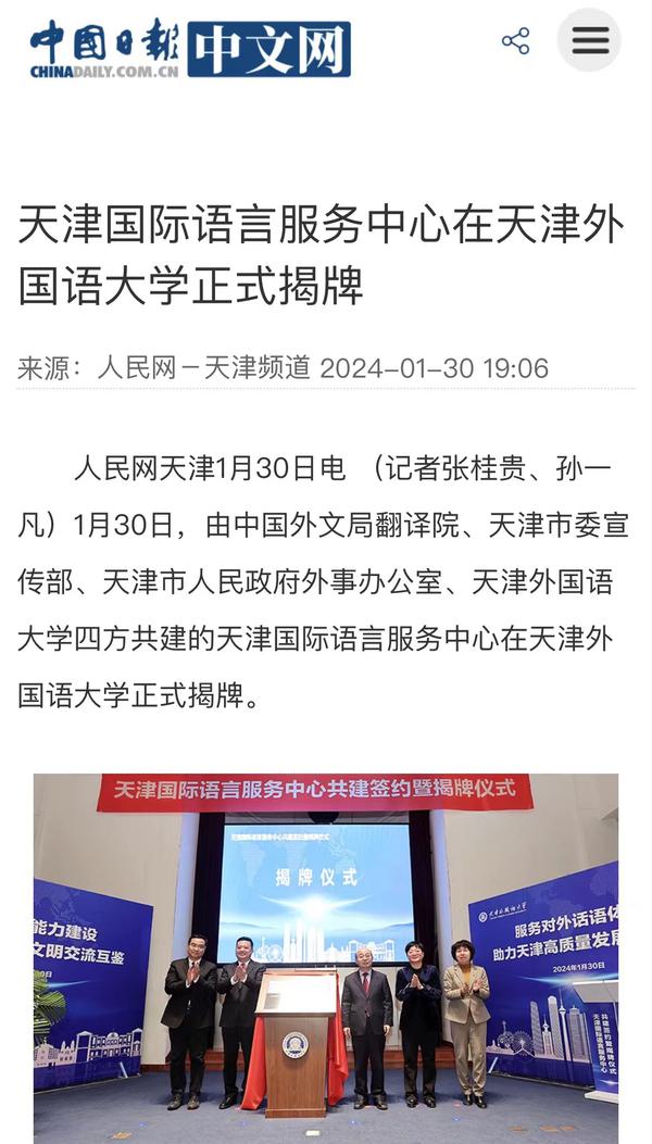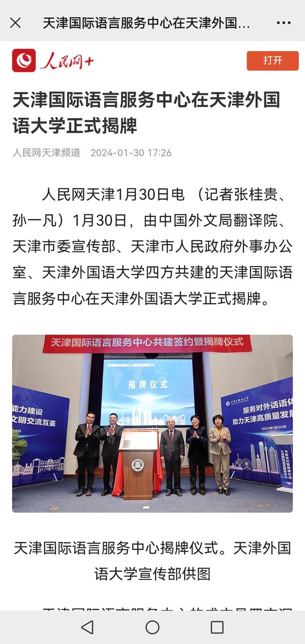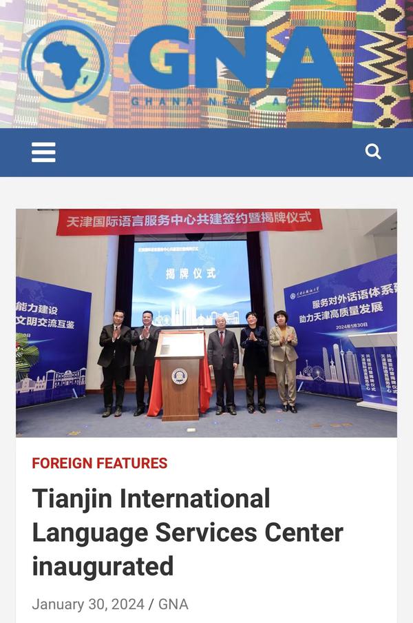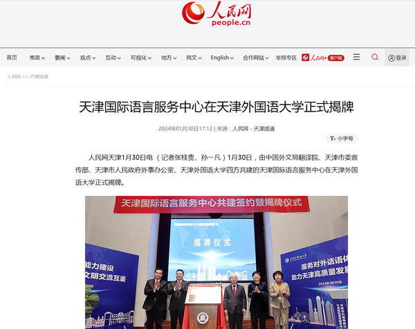 1月30日,由中国外文局翻译院、天津市委宣传部、天津市人民政府外事办公室、乐鱼·体育四方共建的天津国际语言服务中心在我校正式揭牌。中心将打造集服务政府决策、理论创新、实践育人于一体的新型语言服务机构,搭建加强国际传播能力建设、促进文明交流互鉴、助力天津社会主义现代化大都市建设及高水平对外开放的重要平台。人民日报海外版、人民网、新华社客户端、中央广播电视总台国际在线、中新网、央广网、中国日报网、天津日报、天津新闻、津云、北方网等多家中央及天津市媒体,以及美联社、加纳通讯社、尼日利亚通讯社等海外媒体对此进行了报道。