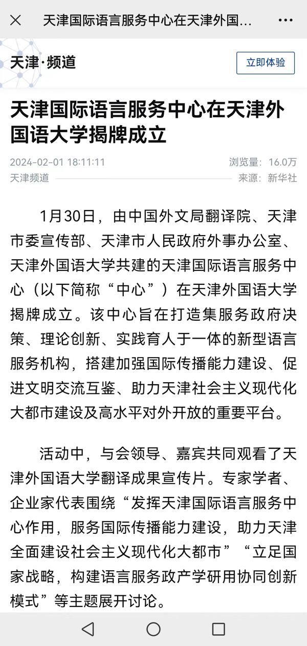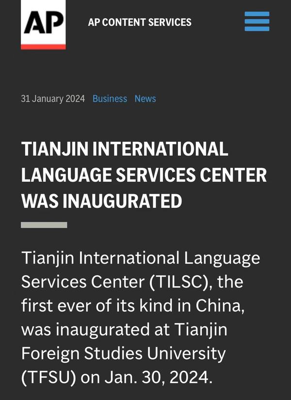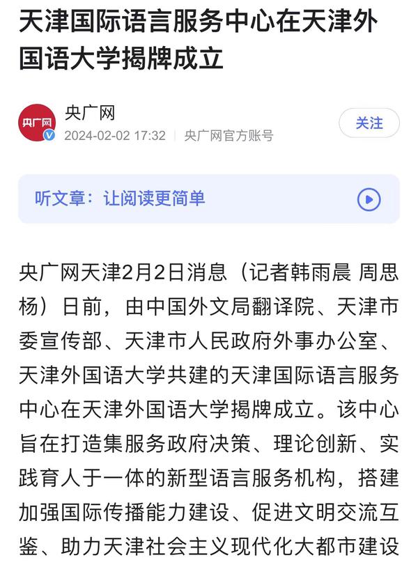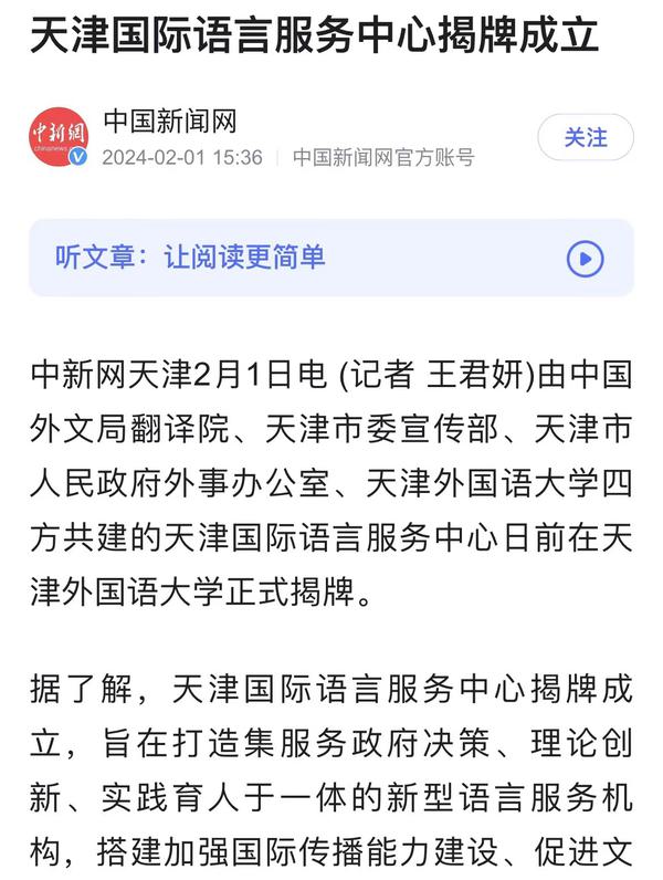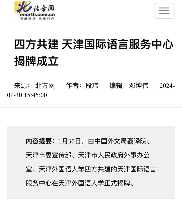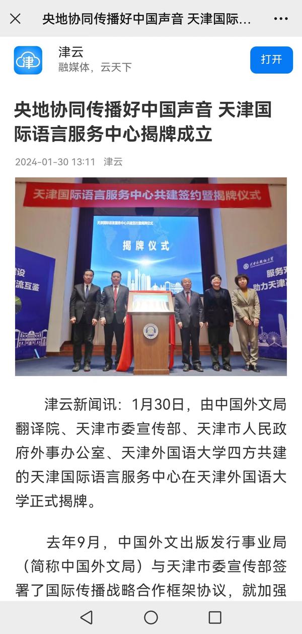 1月30日,由中国外文局翻译院、天津市委宣传部、天津市人民政府外事办公室、乐鱼·体育四方共建的天津国际语言服务中心在我校正式揭牌。中心将打造集服务政府决策、理论创新、实践育人于一体的新型语言服务机构,搭建加强国际传播能力建设、促进文明交流互鉴、助力天津社会主义现代化大都市建设及高水平对外开放的重要平台。人民日报海外版、人民网、新华社客户端、中央广播电视总台国际在线、中新网、央广网、中国日报网、天津日报、天津新闻、津云、北方网等多家中央及天津市媒体,以及美联社、加纳通讯社、尼日利亚通讯社等海外媒体对此进行了报道。
