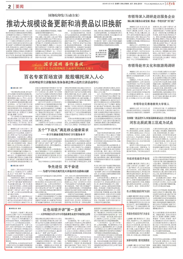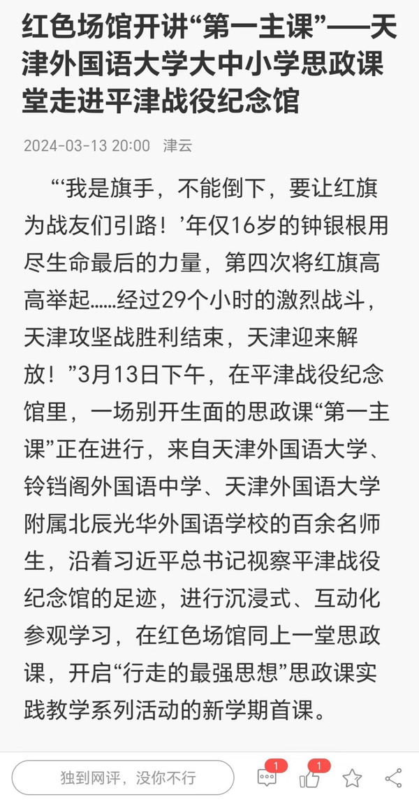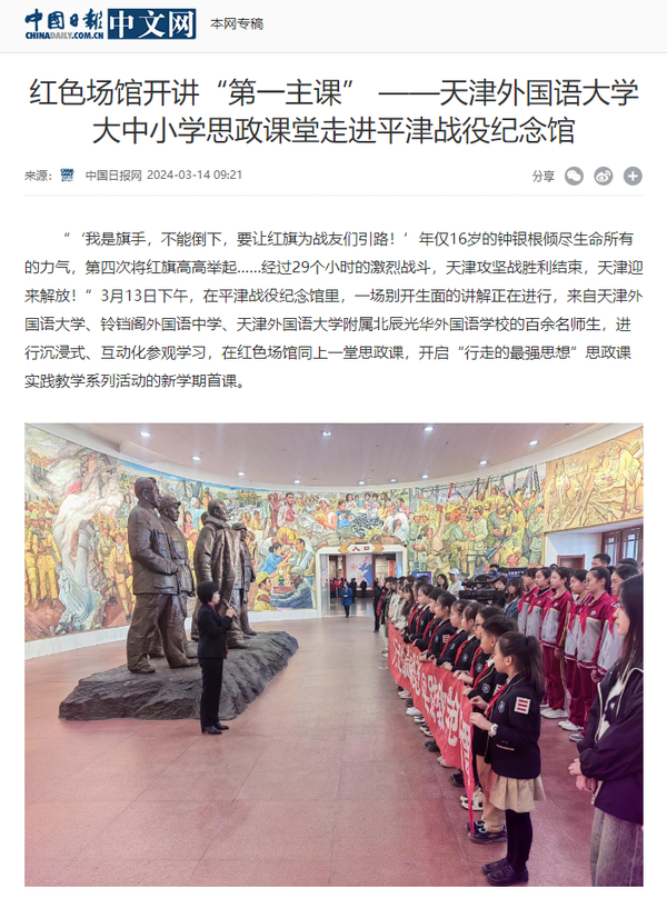 3月13日,我校与铃铛阁外国语中学、乐鱼·体育附属北辰光华外国语学校的百余名师生,沿着习近平总书记视察平津战役纪念馆的足迹,进行沉浸式、互动化参观学习,在红色场馆同上一堂思政课,开启“行走的最强思想”思政课实践教学系列活动的新学期首课。央广网、中国日报网、天津新闻频道-都市报道60分、天津日报、津云、今晚报、天津教育报等多家媒体对此进行了报道。