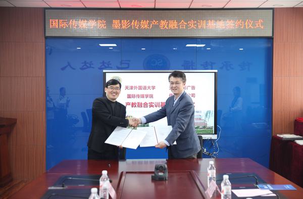 当天下午,国际传媒学院与天津墨影广告传媒有限公司举办产教融合实训基地签约仪式。学院党委书记李鲁宁与墨影传媒总监张威签订产教融合实训基地合作协议,并为四位行业导师代表颁发聘书。