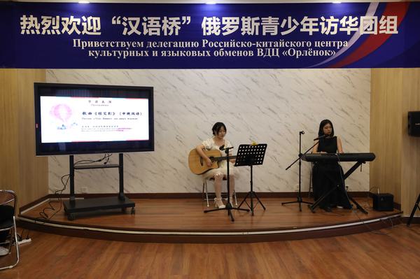 天外艺术团学生杨艺舟、陈祎鋆表演了民舞《瑶光赋》、王晓婧演奏了二胡名曲《新赛马》,欧洲语言文化学院俄语专业学生刘思淼表演了舞蹈《千年风雅》,车雨杭、解嘉怡演唱了歌曲《程艾影》(中俄双语),将现场气氛不断推向高潮。与会人员还观看了“汉语桥”俄罗斯青少年访华团组成员录制的视频。