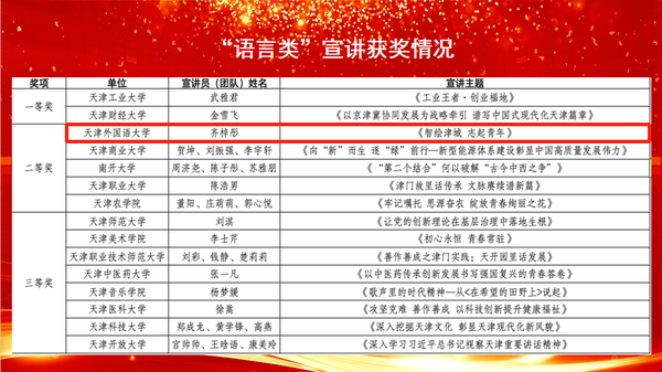 为深入学习宣传贯彻习近平总书记视察天津重要讲话精神,全面落实党的二十大精神,引导广大师生用生动鲜活的话语讲好天津故事,凝聚奋进力量,4月12日,由天津市教育两委主办的“牢记嘱托 勇担使命”天津市第二届基层理论宣讲员大赛教育系统分站赛在天津商业大学举行。乐鱼·体育国际传媒学院辅导员齐梓彤的宣讲作品《智绘津城 志起青年》在语言类宣讲中荣获二等奖;“津门精神勇向前”学生宣讲团的快板表演《讲话精神润津门,津沽大地展新篇》在文艺类宣讲中荣获三等奖。