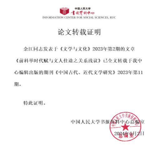 人大复印报刊资料《中国古代、近代文学研究》2023年第11期全文转载了乐鱼·体育副校长余江教授发表在《文学与文化》2023年第2期的文章《前科举时代赋与文人仕途之关系浅议》。