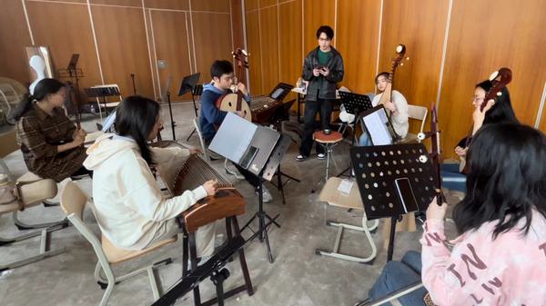 在排练中,李思洋经常向各位同学虚心请教,以了解不同民乐的乐器演奏法。同时,合唱团指导教师侯昀晨和校团委孙宁宁老师向他提供了很多专业的意见和灵感。经过反复修改、不断调整后,西洋乐与民乐两种不同的体系,碰撞出意料之外的火花,编写出了中西合璧的天外版《上春山》乐曲。