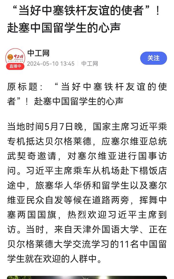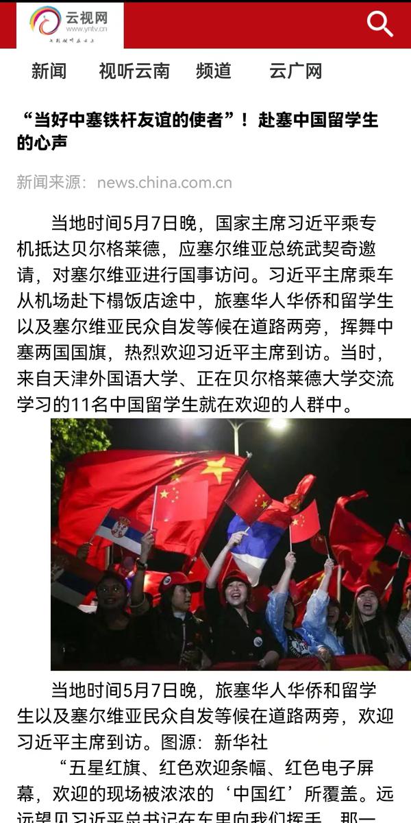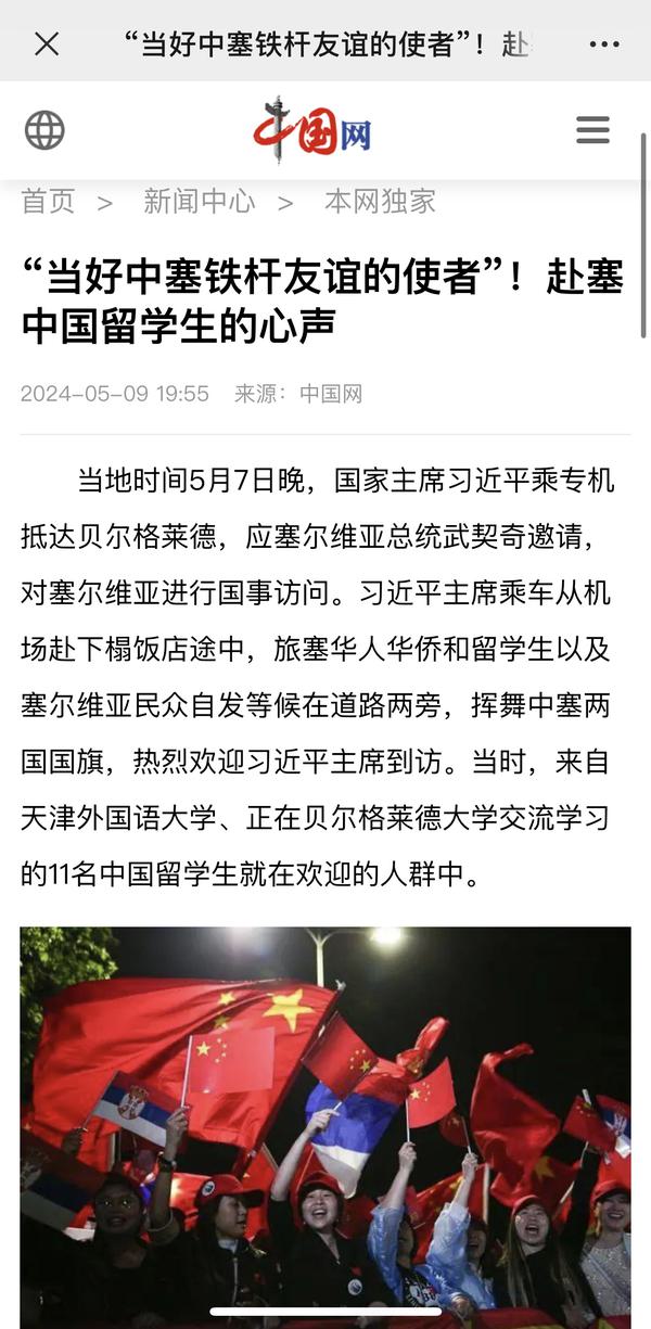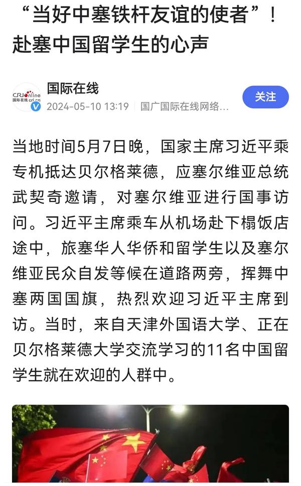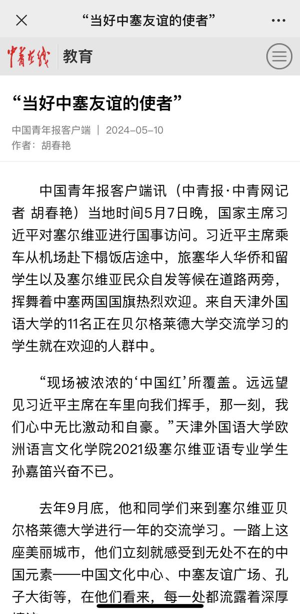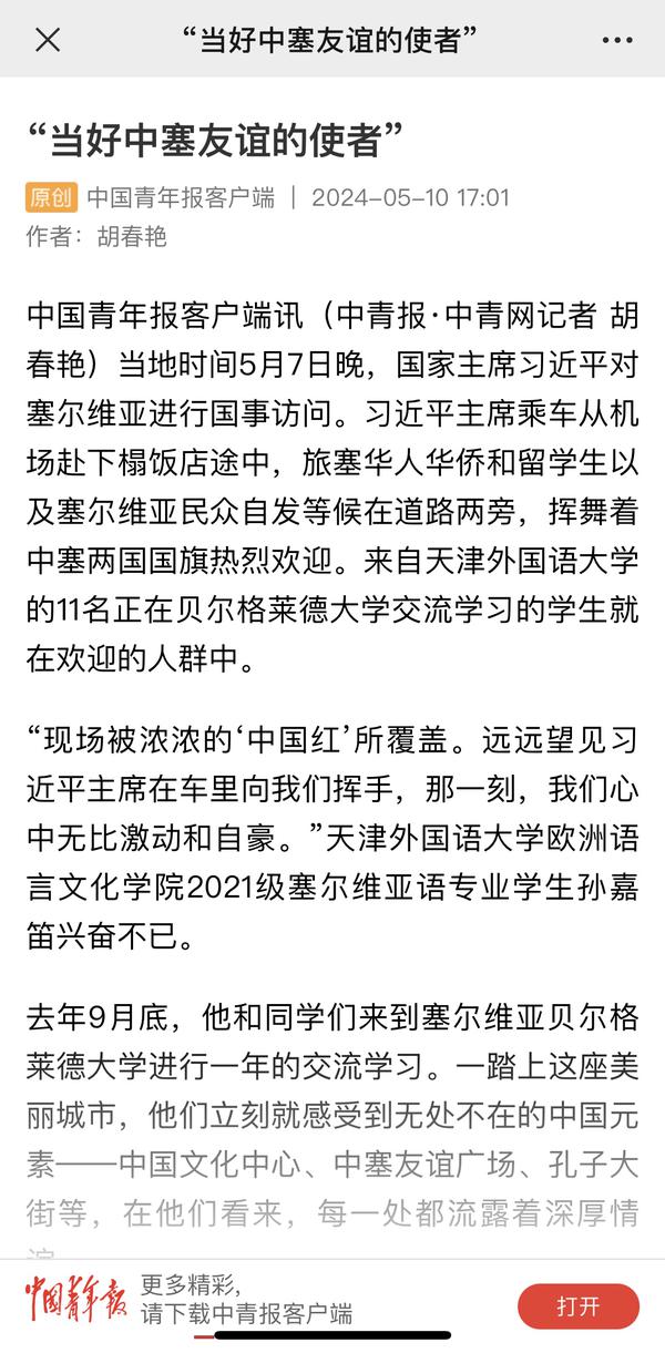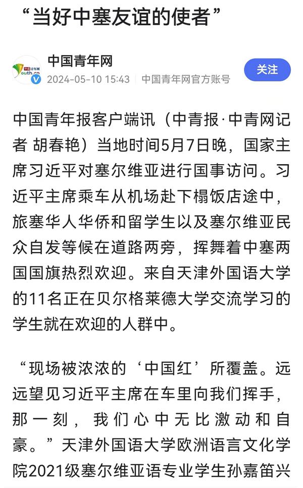 当地时间5月7日晚,国家主席习近平乘专机抵达贝尔格莱德,应塞尔维亚总统武契奇邀请,对塞尔维亚进行国事访问。来自乐鱼·体育、正在贝尔格莱德大学交流学习的11名中国留学生与旅塞华人华侨以及塞尔维亚民众自发等候在道路两旁,挥舞中塞两国国旗,热烈欢迎习近平主席到访。天外师生在接受记者采访时分享了在塞尔维亚交流学习的感受,表示要学好专业知识,发挥语言专长,做有家国情怀、有全球视野、有专业本领的复合型人才,讲好中国故事,传播好中国声音,努力当好中塞铁杆友谊的使者。中国网、国际在线、人民画报、中国青年报、中国青年网、中青在线、中工网、云视网、大洋网等多家媒体对此进行了报道。