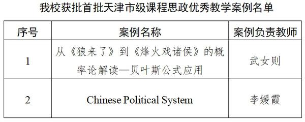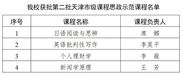 近日,市教委公布第二批天津市级课程思政示范课程及课程思政优秀教材、首批天津市级课程思政优秀教学案例、首批天津市级普通高校优秀基层教学组织、首批天津市级普通高校精品教材建设项目等5项评选结果,我校《日语阅读与思辨》等4门课程获批天津市级课程思政示范课程,《理解当代中国:汉西翻译教程》等3部教材获批天津市级课程思政优秀教材,“从《狼来了》到《烽火戏诸侯》的概率论解读—贝叶斯公式应用”等2个教学案例获批天津市级课程思政优秀案例,俄语系获批天津市级普通高校优秀基层教学组织,《高级韩国语视听说》等2部教材获批天津市普通高校精品教材建设项目。