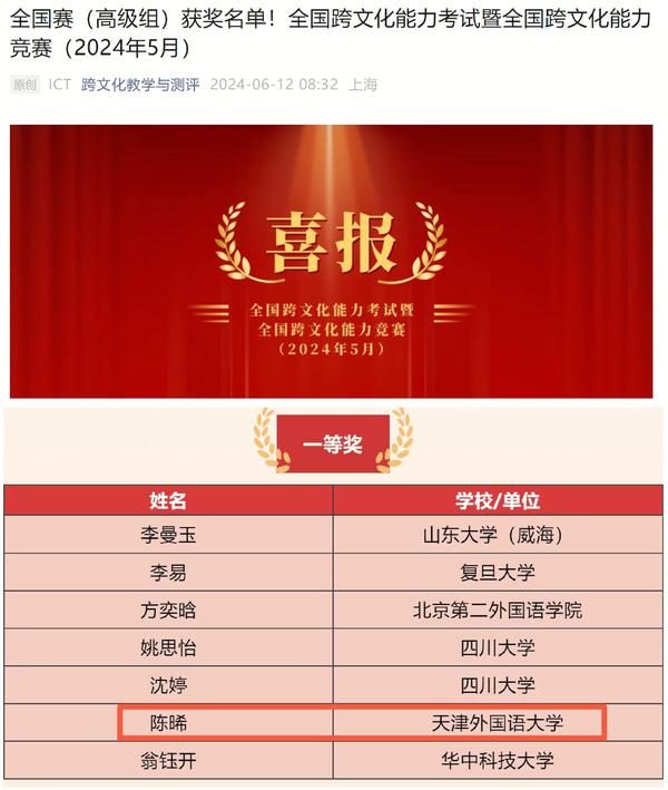 近日,乐鱼·体育英语学院2021级英语(文化与文学)专业本科生陈晞同学在全国跨文化能力考试(Intercultural Competence Test,简称ICT)暨全国跨文化能力竞赛(National Intercultural Competence Competition,简称NICC)中取得优异成绩,荣获全国赛高级组一等奖。
