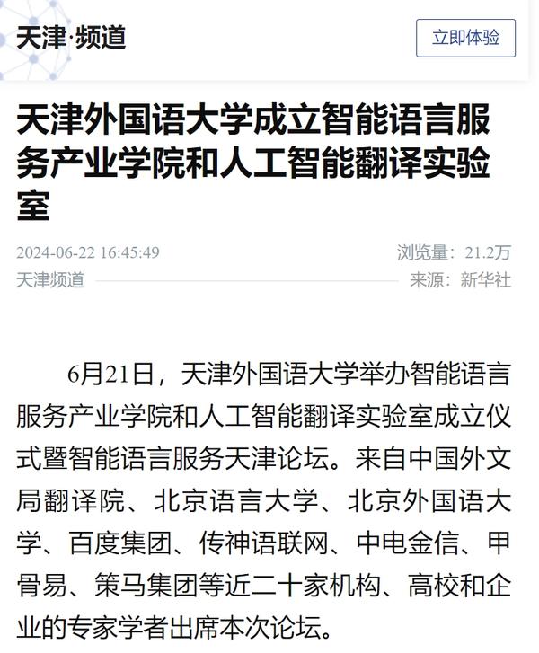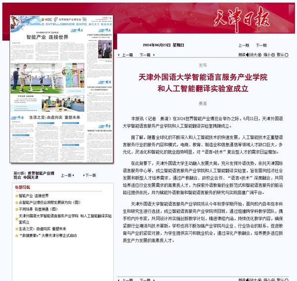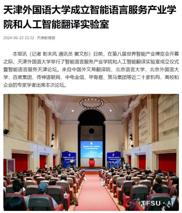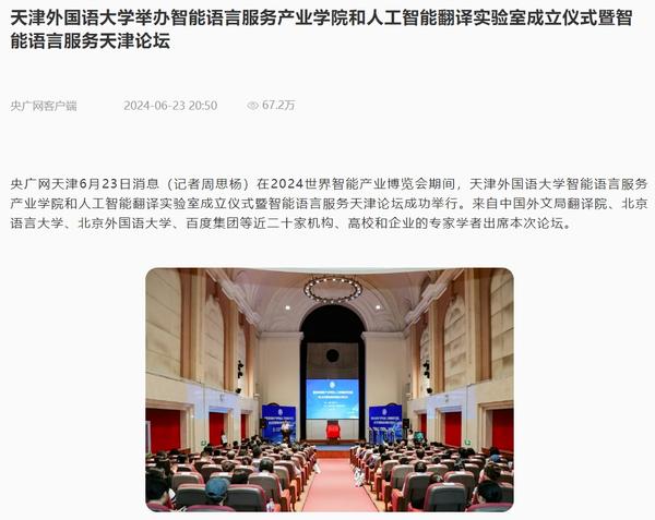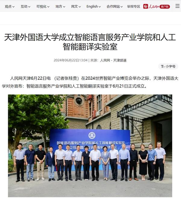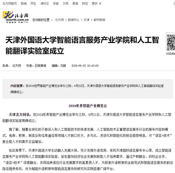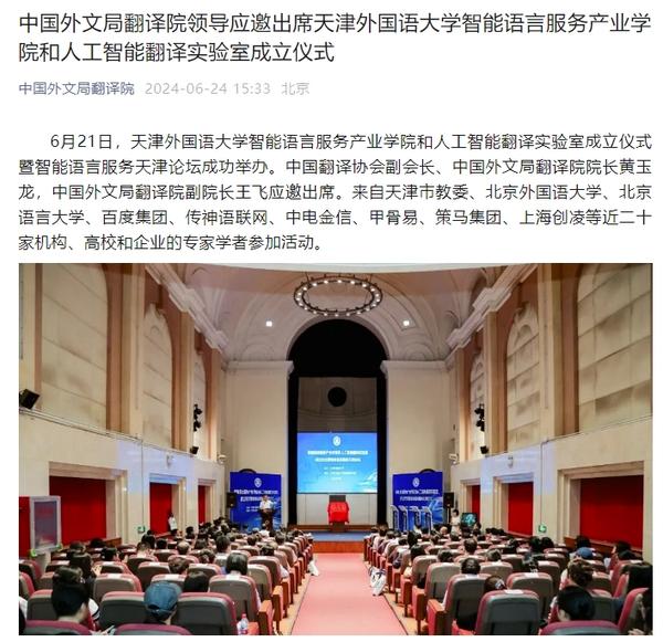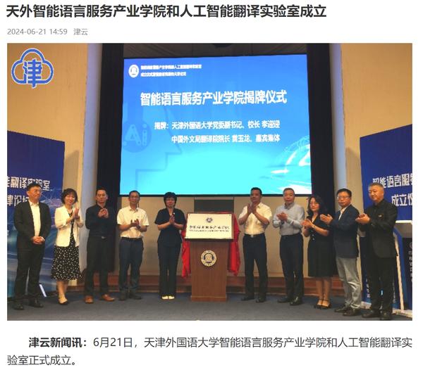 在2024世界智能产业博览会举办之际,6月21日,乐鱼·体育智能语言服务产业学院和人工智能翻译实验室揭牌成立。产业学院和实验室的建立将为学校探索外语教育的全新范式和智能语言服务的前沿路径提供依托,为赋能外语教育和智能语言服务的研究与实践搭建广阔平台。人民日报客户端、人民网、新华社客户端、中国新闻网、央广网、中国日报网、中国外文局翻译院微信公众号、天津日报、津云、北方网、天津教育报头条号等多家中央及天津市主流媒体对此进行了报道。