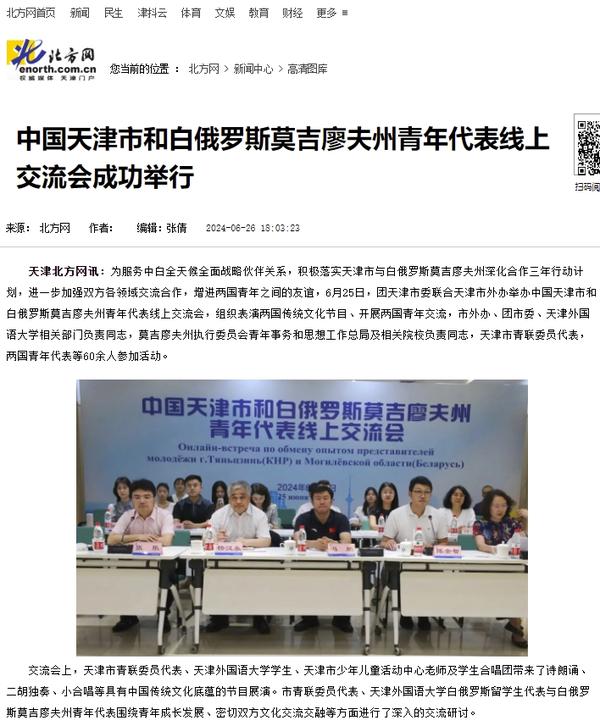 为服务中白全天候全面战略伙伴关系,积极落实天津市与白俄罗斯莫吉廖夫州深化合作三年行动计划,进一步加强双方各领域交流合作,增进两国青年之间的友谊,6月25日,团天津市委联合天津市外办举办的中国天津市和白俄罗斯莫吉廖夫州青年代表线上交流会在天外举行。天外学生表演了诗朗诵《新土地》,白俄罗斯留学生康斯坦丁卡斯杰斯基进行了交流发言,为加强青年国际交流与合作发出了天外之声。津云、北方网等多家媒体报道了本次活动。