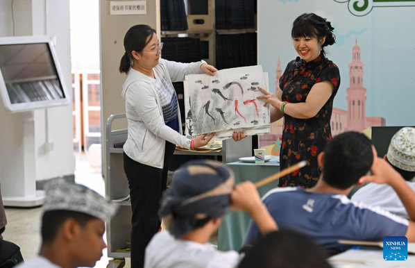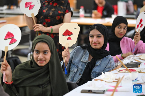 A teacher introduces traditional Chinese paintings to Omani youngsters at Tianjin Foreign Studies University in north China's Tianjin Municipality, Aug. 15, 2024. Twenty-two youngsters from Oman are on a two-week study tour in Beijing and Tianjin to experience the Chinese culture. (Xinhua/Sun Fanyue)