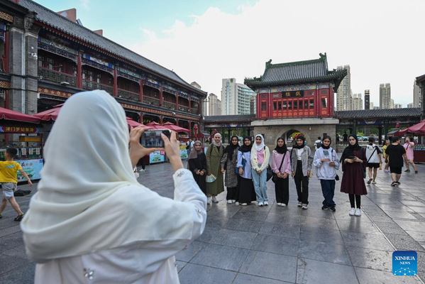 Omani youngsters pose for a group photo at a scenic spot in north China's Tianjin Municipality, Aug. 12, 2024. Twenty-two youngsters from Oman are on a two-week study tour in Beijing and Tianjin to experience the Chinese culture. (Xinhua/Sun Fanyue)