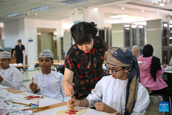 A teacher guides Omani youngsters to try traditional Chinese painting at Tianjin Foreign Studies University in north China's Tianjin Municipality, Aug. 15, 2024. Twenty-two youngsters from Oman are on a two-week study tour in Beijing and Tianjin to experience the Chinese culture. (Xinhua/Sun Fanyue)