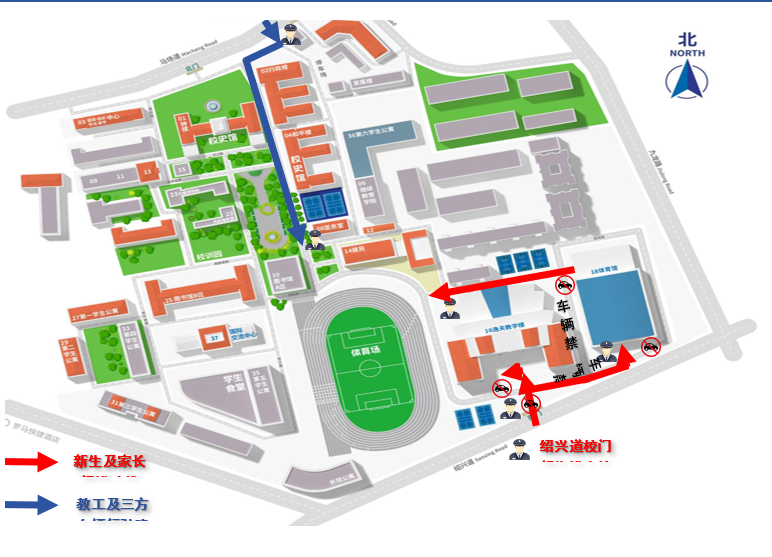 绍兴道校门:9月12日7:00至19:00机动车辆禁止通行,原有机动车道改设为4条新生进出校专用通道,新生及家长可通过专用通道步行入校。两侧闸机仅通行行人和非机动车,在校生及教职工可通过闸机步行或骑行非机动车进出校。