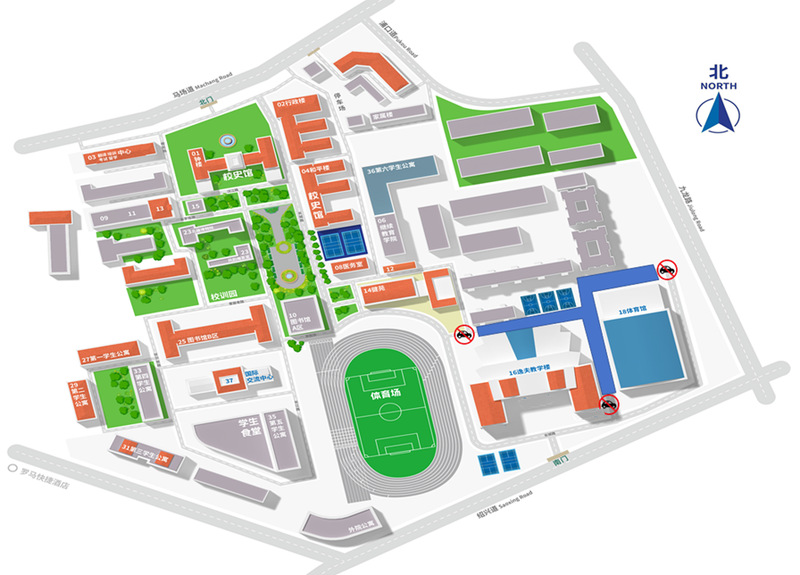 马场道校区逸夫楼北面道路、逸夫楼与体育馆间道路、体育馆北面道路作为军训场地,每日7:30至11:00、15:30至18:30禁止通行机动车辆,全天禁停机动车辆。体育馆东面停车场内车辆从体育馆南面道路进出停车场。