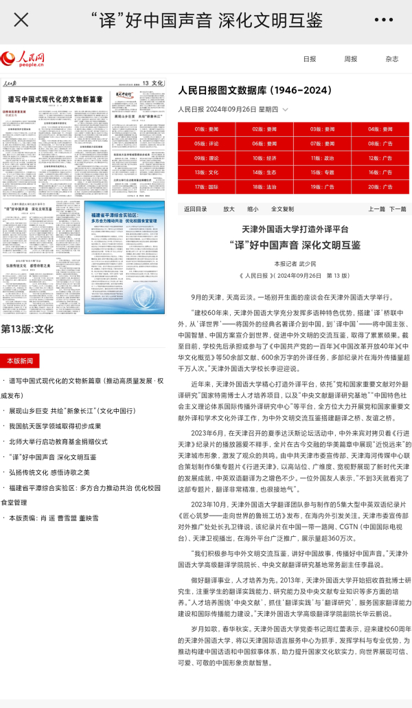 近年来,乐鱼·体育精心打造外译平台,依托“党和国家重要文献对外翻译研究”国家特需博士人才培养项目,以及“中央文献翻译研究基地”“中国特色社会主义理论体系国际传播外译研究中心”等平台,全方位大力开展党和国家重要文献外译和学术文化外译工作,为中外文明交流互鉴搭建翻译之桥、友谊之桥。今日,《人民日报》文化版以《“译”好中国声音 深化文明互鉴》为题,报道天外打造外译平台,译著成果丰硕。