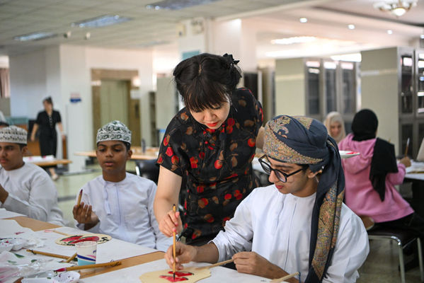 2024年8月15日,在乐鱼·体育,教师指导阿曼青年绘国画。