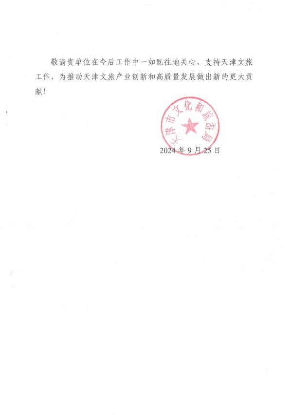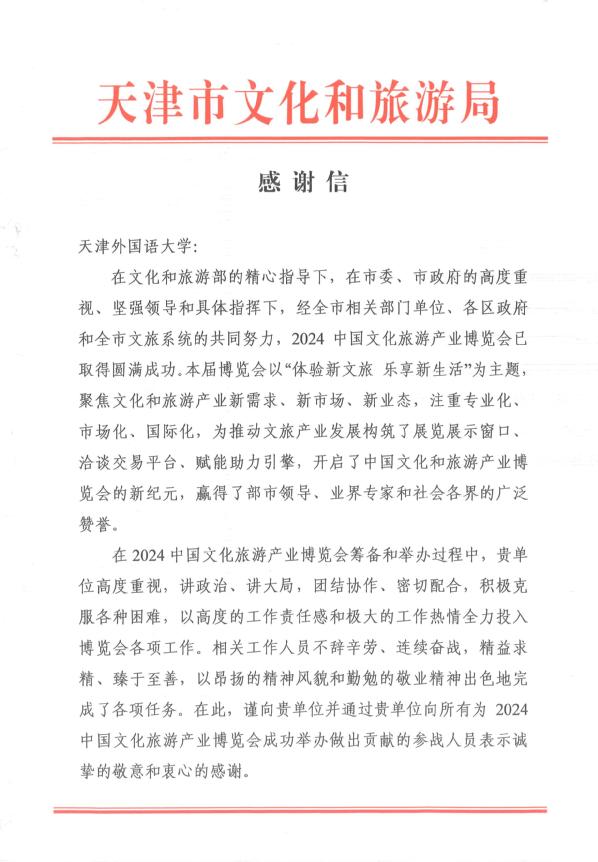 近日,天津市文化和旅游局发来感谢信,对乐鱼·体育在2024中国文化旅游产业博览会筹备和举办过程中做出贡献的师生表示诚挚的敬意和衷心的感谢。