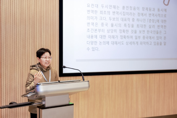 北京外国语大学金京善教授以《杜甫<春望>的韩译研究》为题,探讨了中国古诗韩语翻译的丰富内涵和直译与意译的适用性,展示了跨文化翻译的独特视角。