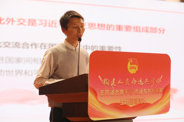 在践行构建人类命运共同体主题发言环节,天津市人民政府外事办公室联络处处长李文家以“做融通中外的使者”为题,以“身边的国际社会”为主线,生动形象地讲解了习近平外交思想在天津的实践,介绍了天津在对外交流中的优势和特色,并以自身在实际工作中的经历和感悟,鼓励同学们要把握好“求中”的根基,深入学习中国历史和传统文化,厚植家国情怀;同时,也要学好专业知识,在“求外”的实践中发挥专业优势,坚持胸怀天下,践行使命担当,争做融通中外的使者。